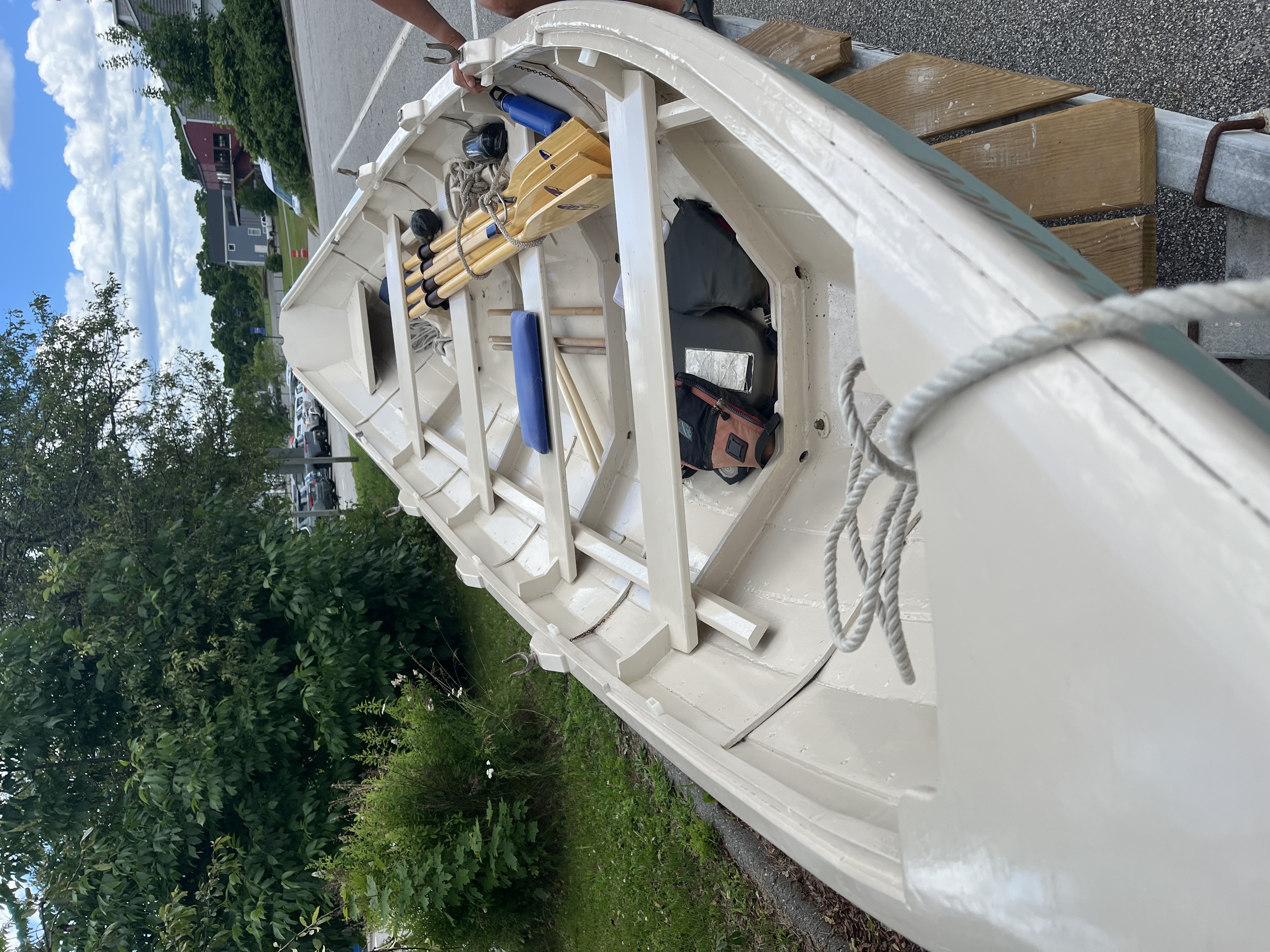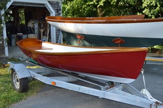 New rails, breast hook and stern quarter knees. Multiple coats of Epifanes varnish. 7' oars with hand sewn leathers. No trailer. $3,500.