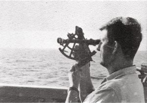We were sent to the Decca range in Exuma Sound, the Bahamas, where Decca accuracy was reportedly plus or minus 34 feet, the best attainable at the time. The civilian technicians worked away at comparing the position fixes from the various systems, while I carried out my navigation duties in the normal manner: star sights at dawn and dusk; sun sights during the day, sky conditions permitting. One lovely Bahamian day, I was on the bridge wing, taking a noon sight with my sextant. I sensed someone walking up to my elbow. When I took the sextant down and turned, there stood one of the civilian technicians shaking his head. “Here you are with all the world’s most sophisticated electronic navigation equipment on this ship,” he exclaimed, “and you are still navigating like Christopher Columbus.”