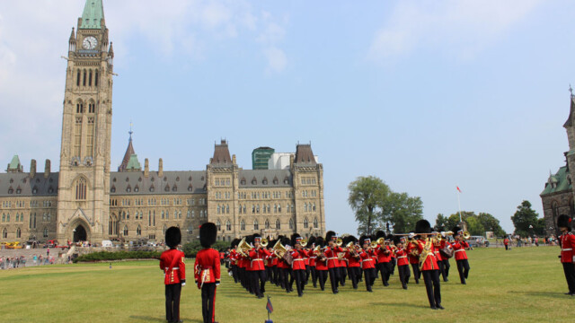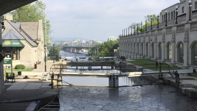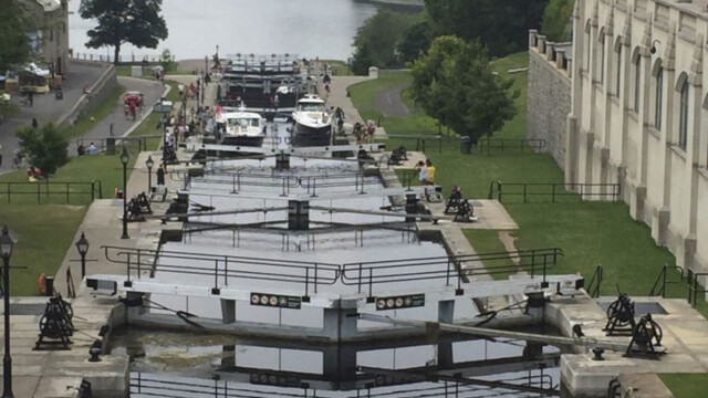 We arrived in Ottawa, the end of the Rideau, to enjoy that big, but still quaint and wonderful, city. We tied up to a wall at the foot of the hill across from the Parliament Building. Every morning, we were in a front-row seat to watch the changing of the Palace Guard. They formed ranks on the side of the hill, played their bagpipes, and marched away to the Parliament building – we followed them for the hour-long ceremony.