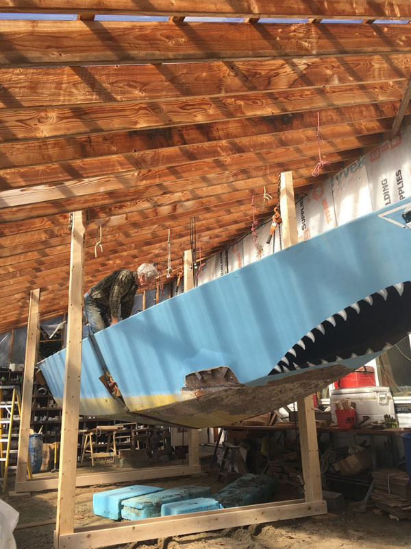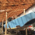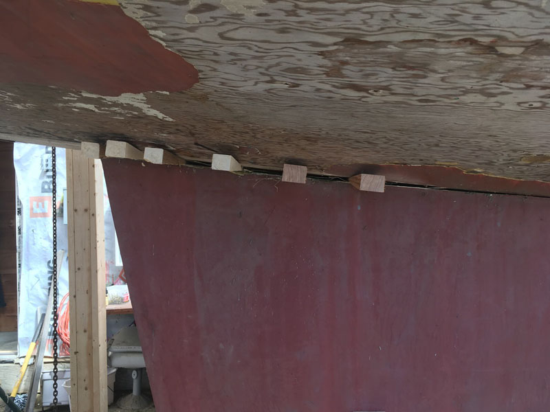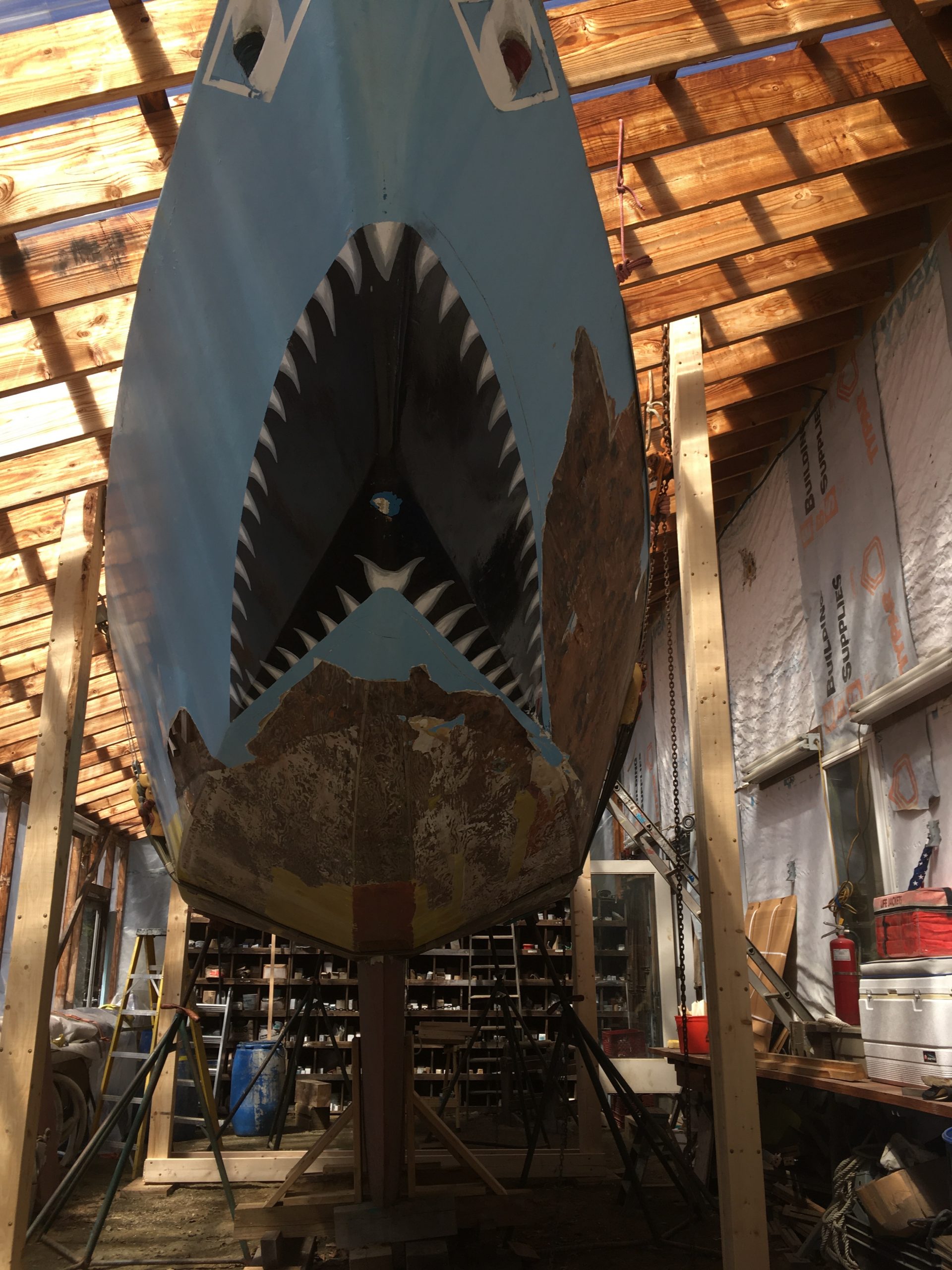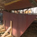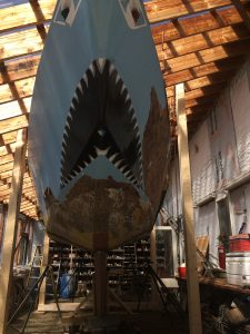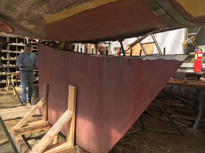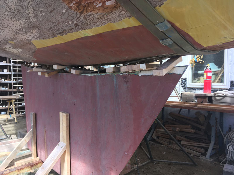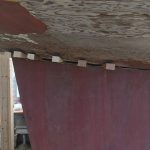 Next weekend’s shelter in place chore is to flip the hull over in its slings. Some time after that hull will be refiberglass and the keel repositioned after her own makeover. One look at the keel boats, with their rust and twists, got the collective wondering, perhaps, if making a new keel might be a better solution. Curious and intelligent Points East readers, feel free to send ideas for how to flip the plywood hull in her slings. (And feel free to point us in the direction of ideas about designing and building her new keel.)