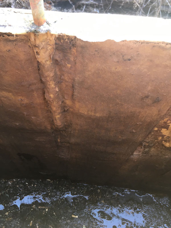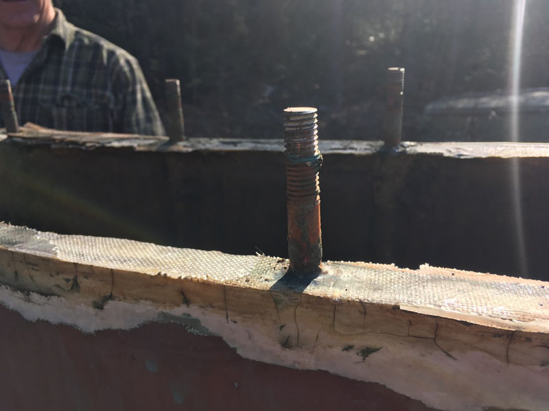 The keel bolts had been taken off, and the hull slings put in place. A combination of hauling the hull up on her slings (note the frame for the slings built for the purpose) and hammering wooden wedges slowly widened the hull-to-keel gap. Once the keel was free of the plywood (Weldwood Royal Marine!) hull the task was to haul the keel out from under the hull on its homemade skid. Tractor with a chain bridal was the right combination for that. Once the keel was away from the shed we had a little look inside it: water, mung, and keelboats fiberglassed in place in kind of a rube Goldberg fashion. And while I have not looked closely at many keels to see exactly how their bolts are secured, this approach was mildly surprising. I guess I expected a wee bit more structural metal.