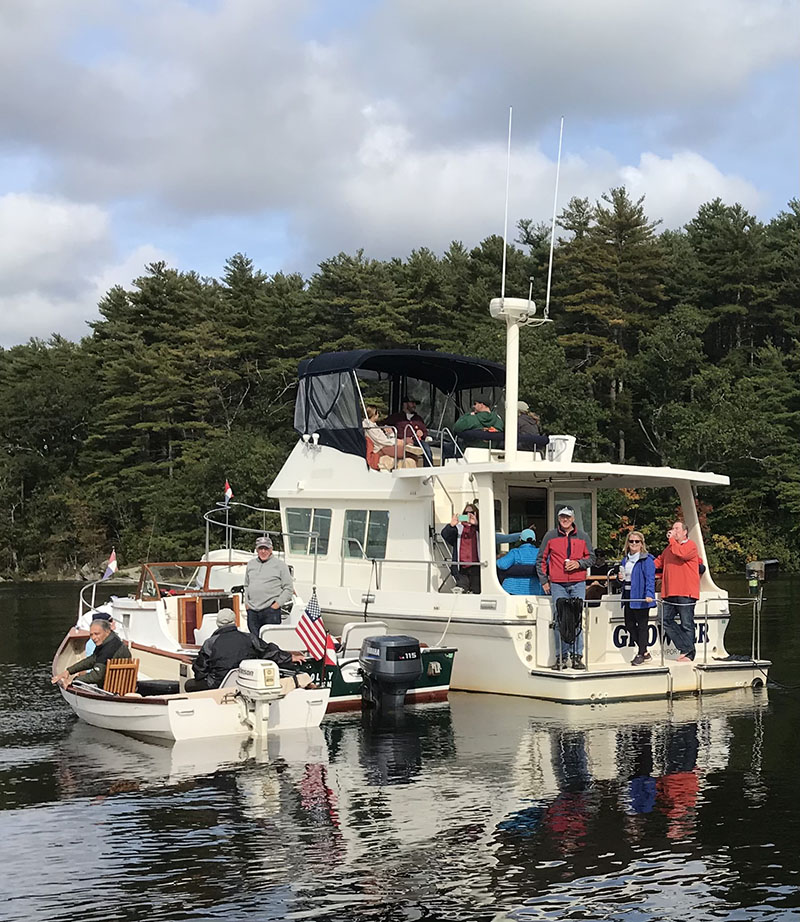 Today (Saturday, Oct. 9) the American Yacht Club of Newburyport held their Merrimack River Fall foliage cruise. This raft-up of boats participated. It was a lovely autumn day on the water. I am a life member of the AYC. Funny, I generally don’t feel that old.
