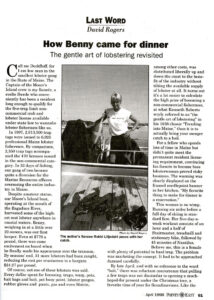 David Rogers is a Points East original. We’re not sure where we found him or he found us – we’re just glad it happened. Since this piece appeared in the April 1998 edition – our first – David has written frequently for Points East. David and Robbi were married in Iceland. They still live in Cape Elizabeth, but are no longer lobstering. Dave notes, however, that Robbi did obtain the status of “best fisherman” after loading one of her traps with a bottle of Jack Daniels for her father to discover.