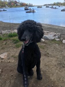This is the York River in York Harbor, Maine. The picture was taken just south of the lobsterman’s dock where there is a place to launch kayaks and other small boats. There are also picnic tables where I like to sit during my walks. This is on the road out to York Harbor Marine. I live in Kittery and walk here often. There are many nice walks in the area. We haven’t been here by boat in many years, maybe this summer. Here is, Thula, the poodle, in that same spot.