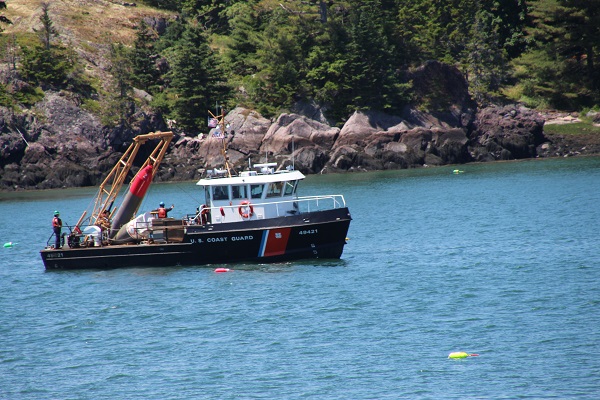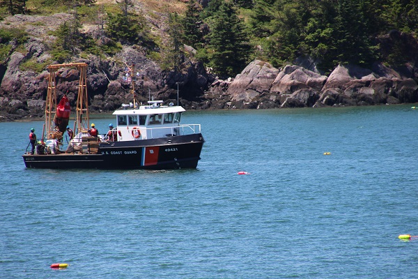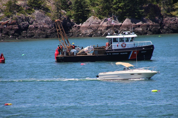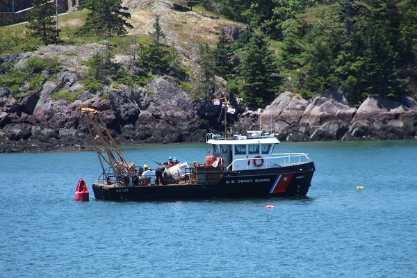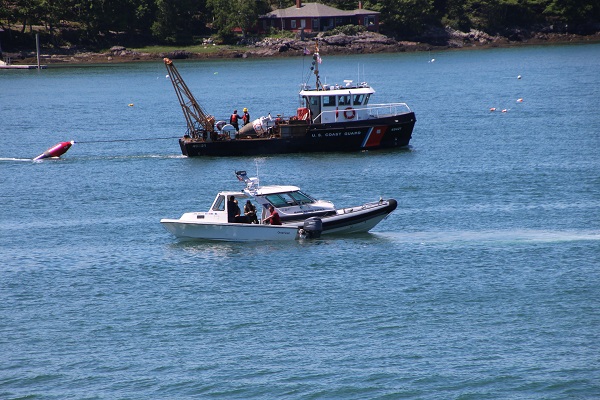 So, I was snapping a few photos of the Coast Guard servicing the Nun #10 channel marker in the Fox island Thorofare. While watching the new nun being launched, the existing nun’s bottom being scrubbed, figuring the new nun would take its place…when I heard the Marine Patrol (Clam Cops) siren pull over a boat load of clammers and clams. While checking their paperwork, the Coast Guard boat proceeded to tow the new nun through the background of the clam discussion. Not often you see these two activities in one frame. And it left me scratching my head about the new vs old nun’s role in all of this!