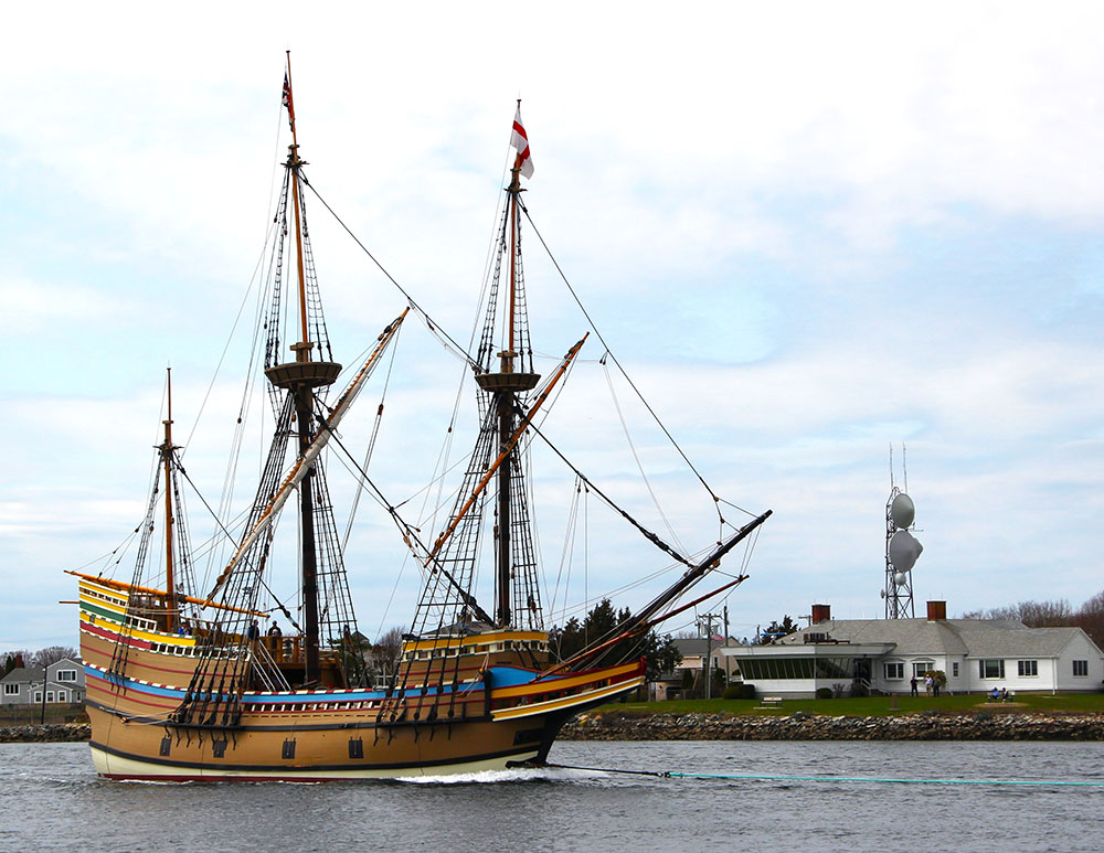 Points East ad rep Peter Partridge caught this image of the Mayflower II as she was being towed home to Plymouth, Mass. from her winter drydock in Mystic, Conn. where she received routine maintenance and repainting. Peter writes: