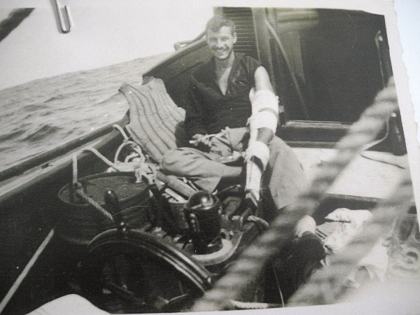 On Sept. 15, within 300 miles of the Azores, a storm overtook Seven Seas, and Stanley broke his arm when a wind shift caused a violent jibe. “. . . Joe cut one of our oars to size and padded one end to fit under my arm. . . . We were ready to pull the arm straight. . . . It wasn’t a bad job for amateurs . . . . the entry in the logbook reads: ‘Slight delay for one broken arm!'”
