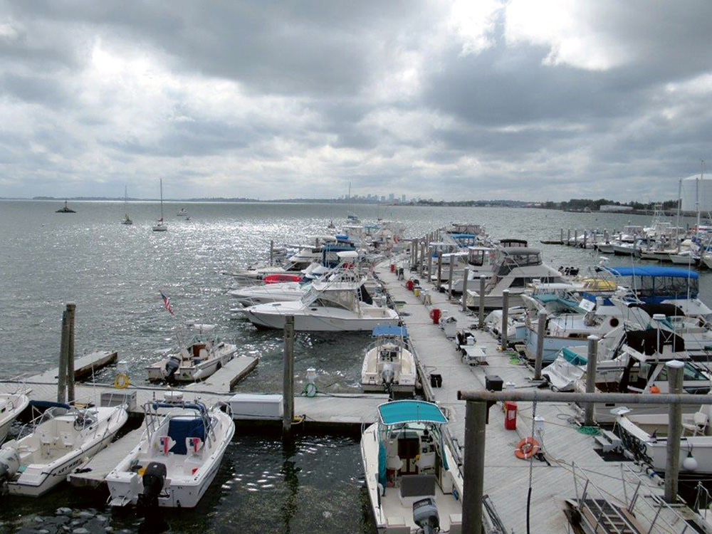 The answer is Volunteer Yacht club in Lynn, Mass. My uncle Bob used to take me there flounder fishing. I remember two launch ramps, one on each side of the bay. We’d often launch on the Nahant side. Usually it was on a Saturday morning, early, depending on the tide. High, and out-going, were best, and sand worms the bait of choice. The view of the skyline of Boston, and the big white tank, were what gave the location away.