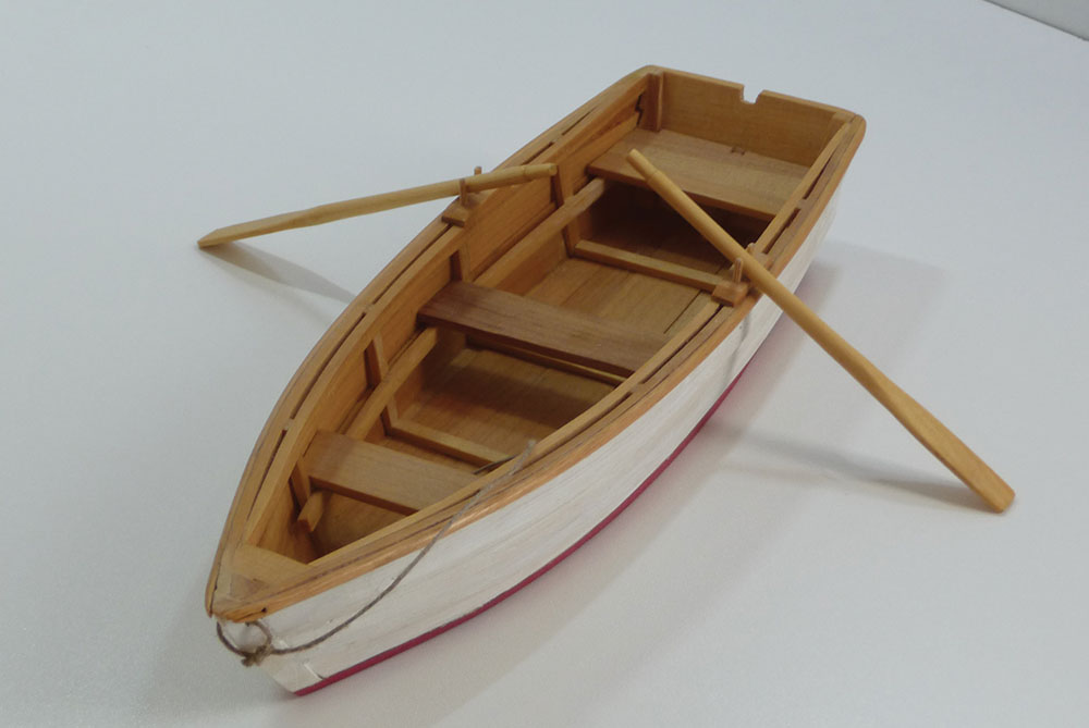 At the same time, Pendleton begins creating the other components of the boat. Ribs are soaked and shaped over a different mold. Trim, gunwales and other details are fabricated, trimmed and sanded and then fitted to the hull. He also carves a pair of oars for each rowing craft.