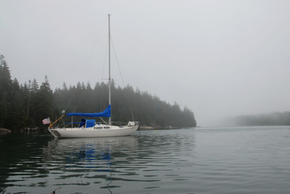 I had the shining sea to myself. Eventually bringing the bell off Schoodic abeam, I tried, without luck, to sight the spire of Petit Manan Lighthouse, nine miles up the shore. Messengers of a southwesterly teased and evaporated three times before holding steadily enough to raise sail and quiet the engine. Making a civil four knots of it, I was tempted to motorsail, but held on, willing to pay the price of thoroughly agreeable peace.