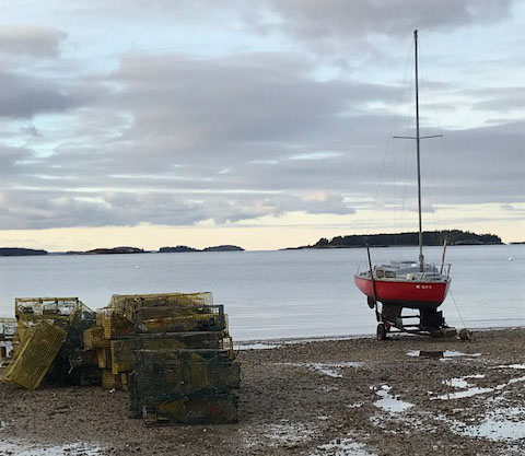 On the beach, Cape Rosier, Harborside, Maine. This gently sloping beach draws picnickers, dog owners, beachcombers, and waders during the season. And at the end of the season, it’s a place where local fishermen offload their traps at high tide and come by truck to pick them up at low tide. Bringing sailboats ashore is also a sign of the season.