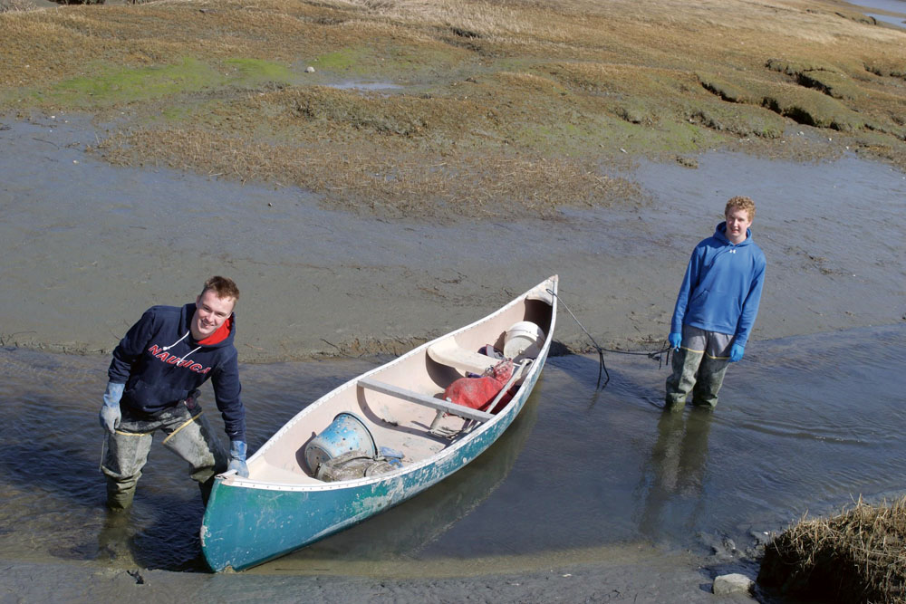 Trombley’s fresh catch was supplied in part by two Brunswick high school sophomores. About 10 minutes away from Ray’s storefront on Thomas Point Road, Sam Cassidy and Declan Lay stood in a stream that flowed sluggishly through the muddy sand of Maquoit Bay. The tide was receding and they were ready to start digging. Both wore hoodies and tall rubber boots. They sold their clams at 25 cents each to fill the totes in Trombley’s shop. How many could the two enterprising young men harvest in a day? “Maybe a thousand,” Lay said, holding a rope tied to the front of a canoe. He and Cassidy would tug it along the stream to where the tide ebbed.