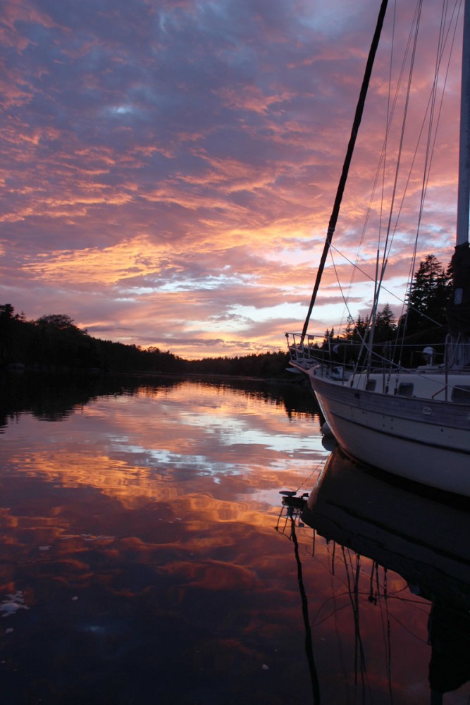 September is prime cruising weather, especially when the days begin and end with such lovely colors. Here are some from our very own Lynn Whitney! Above, sunrise on the Fox Island Thorofare taken through the boathouse doors. At right, sunset on Perry’s Creek. We’d love to see some from you as you are out and about in the waning, but beautiful, days of summer and early fall.