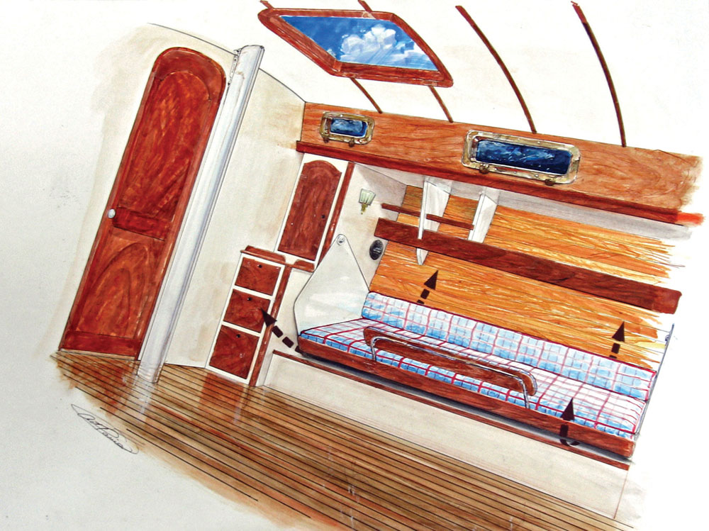 This sketch by Art Paine shows how a gimbaled berth would provide for level sleeping comfort, regardless of the forces affecting the heel of the boat. Drawing by Art Paine