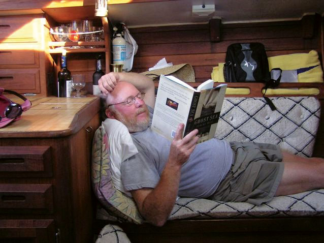 The author in “hunkered-down” mode, reading 1/2 hour of every two. Photo courtesy Dave Roper