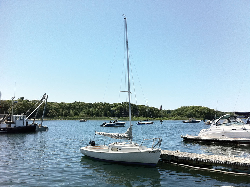 Eventually I secured a mooring in Red Brook Harbor, on the side of the Cape where I lived and worked, so I gave up the one in Lewis Bay. One day I tied my tiny fiberglass dinghy to the stern of the Mariner, which we had renamed Blue Skies, and set off on a 35-mile sail along the south coast of Cape Cod, through Woods Hole and up into Buzzards Bay. It took exactly eight hours, which worked out to an average speed of just over 4.3 knots – not too bad for a 19-foot sailboat towing a dinghy. That trip proved she was a seaworthy little vessel. She handled the chop in Nantucket Sound and Buzzards Bay like a champ.