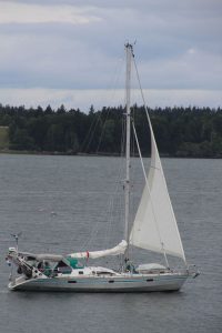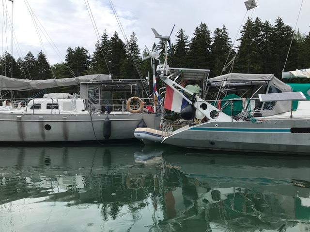 Unusual sight on two moorings, rafted stern to stern in narrow Perry’s Creek on Vinalhaven, two aluminum ocean-going, international visitors. Comparable in size, Maake-s from Holland and Long John Silver from Netherlands. The latter was documented by My Ship Tracking as 12 x 4m, approx. 40′ x 13′. It also indicates Norfolk, VA as the first US port of call which they left 6/26.